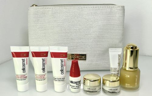 Purchase two or more CellEctive skincare products in your order and you will receive a FREE stylish Cellcosmet pouch worth £280 (£336 inc Vat) which contains: 15ml CellLift Serum, 3ml CellLift Cream, 5ml CellLift Neck and Décolleté Cream, 1.5ml CellLift Eye Contour Cream, 5ml Gentle Purifying Cleanser, 5ml Activator Gel, 5ml Active Tonic, 3ml Exfoliant Dual Action. The pouch will not appear as an item in your cart, but it will be added when orders are prepared at our premises in Knightsbridge, London.