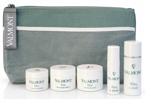 Valmont orders of £450+ receive a beautiful FREE pouch which contains: 10ml Vital 24 Hour Light, 10ml Vital Regenera Rich, 10ml Vital B Fluid, 5ml Vital B Serum, 5ml Vital Contour Cream - with a value of £221. The free pouch will not appear as an item in your cart, but it will be added when orders are prepared at our premises in Knightsbridge, London.